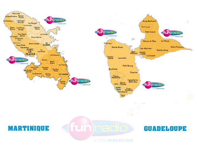 MARTINIQUE : Fort de France 103.9Mhz - Trinité 88.1 Mhz - GUADELOUPE : Basse Terre 96.6 Mhz - Pointre a Pitre 103.4 Mhz GUYANE: Cayenne 102.9 Mhz - Kourou 89.7 Mhz - Sinamarry 98.5 Mhz - Iracoubo 103.5Mhz - Mana 106.8 Mhz St LUCIA: Gros Islet 96.5 Mhz
